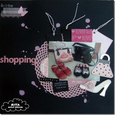Carstock rayher nero, schizzi di acrilico, centrino opitec, tag di vestiti alle quali ho aggiunto il twine, ritaglio di una patterned a tema la scritta era Love to shop (ne rimane solo un ultimo pezzettino come quello usato qui!),dymo per la data, graffetta freccia, chipboards (che avevo comprato nel 2009 doppie... per il SJ di Pam e per me... e non vedevo l'ora di usarle!), tag elle's, ritaglio infocrea, washi, timbro vip sultane, farfallina sultane, per la cucitura ha usato una nuova testina della easy sew e per il titolo alfabeto glitterato sassafras.